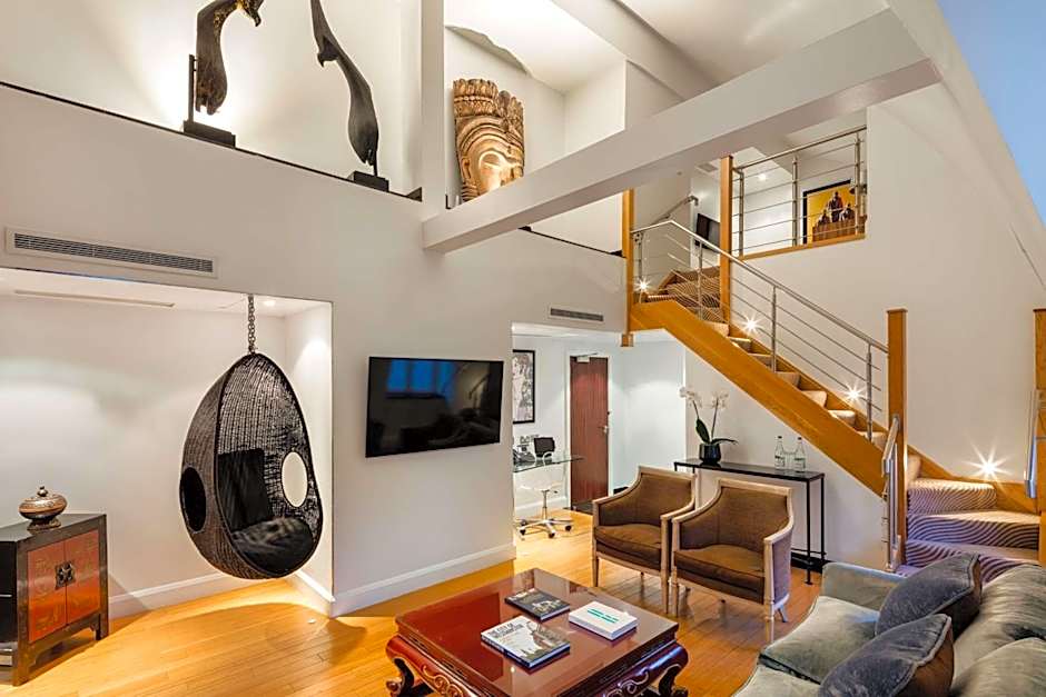 This unique air-conditioned suite features a downstairs lounge and a bedroom with a king-size bed on the mezzanine level. It is individually designed and includes a mini fridge, in-room safe, and a digital entertainment system with a TV. The suite also includes an iron, tea facilities and Nespresso machine, complimentary Wi-Fi, and international phone sockets.